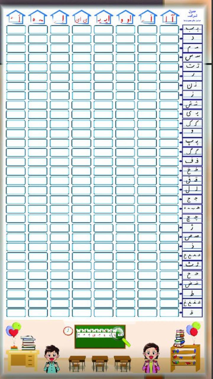 جدول ترکیب مصوت ها و صامت ها. مناسب برای کلاس جهت کلمه سازی، بخش خوانی و ترکیب صامت و مصوت